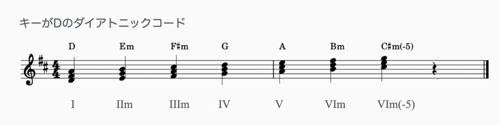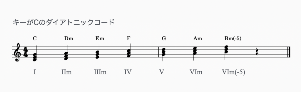 たとえば、キーがCメジャーなら、トライアドのダイアトニックコードはこんな感じです。