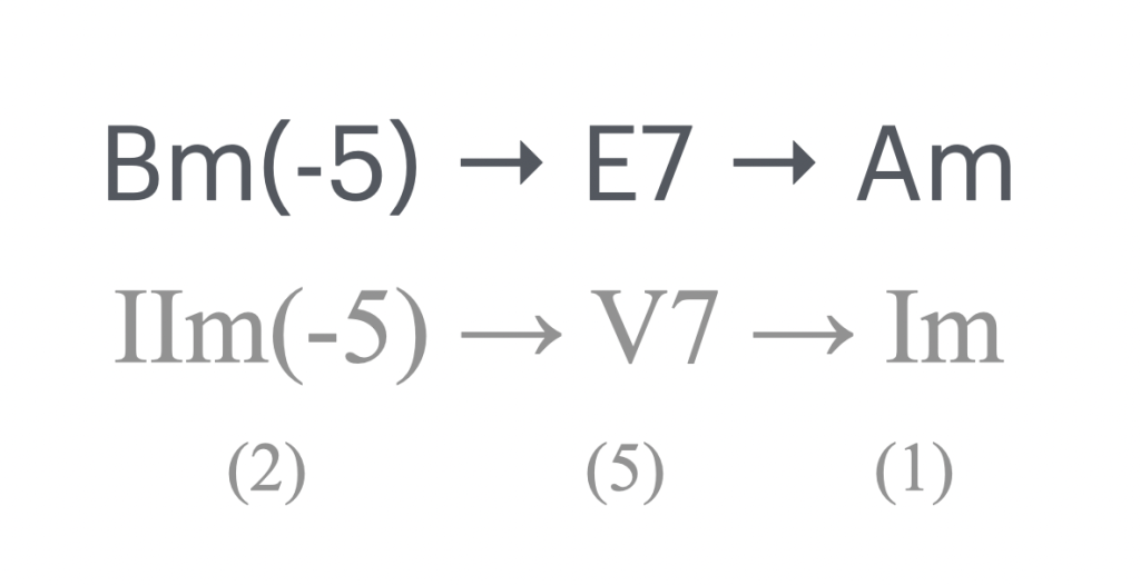 見慣れないIIm(-5)という減三和音のコードがでてきますが、この進行もジャンル問わずでてきます。